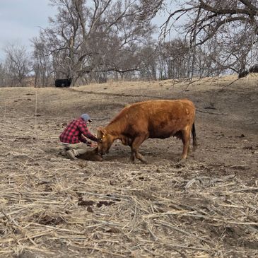 Alex tagging a calf and giving it its first health check, with mom standing close by to make sure everything is done right.