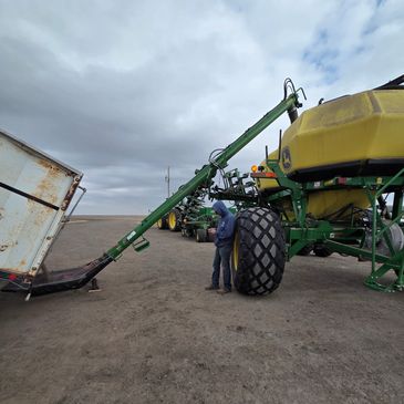 Tim filling the drill with oat seed and fertilizer as spring fieldwork begins.